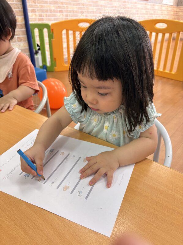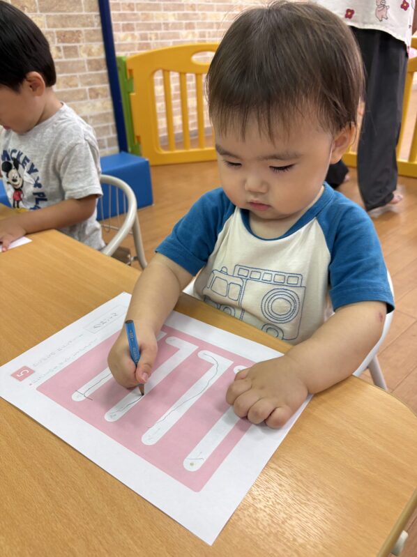 バーンで持つよと伝えると上手に持ち真剣に線を書いています。