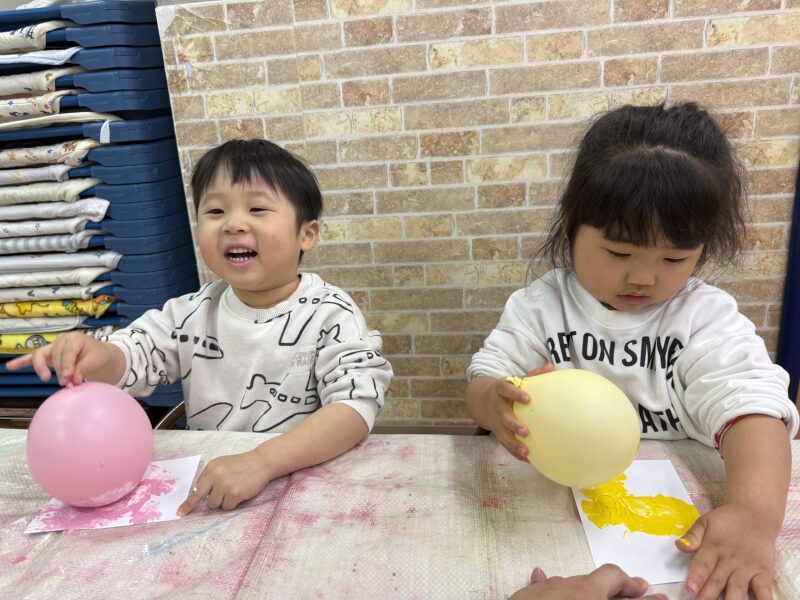 チューリップの制作をしました。風船に絵の具をつけて色々な模様を楽しみました♪